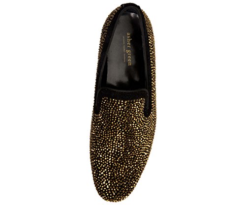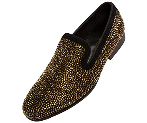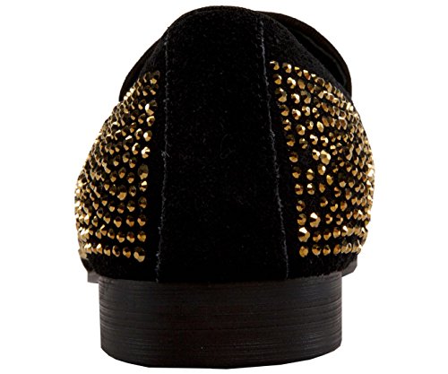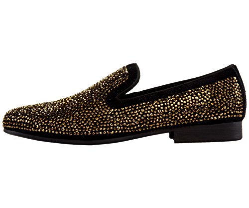 Binding : Apparel Product Description All eyes on you: These gold crystal-encrusted genuine suede tuxedo slippers are the ultimate statement-making dress shoe. Whether it's for the holidays, a special occasion such as prom, or simply for a night out, these eye-catching shoes are essential for elevating your entire outfit. The classic smoking slipper silhouette is completely covered in gleaming gold crystals which contrast a Black suede upper, giving this slip-on an eye-catching two-tone design. A low block heel and leather lining make these loafers comfortable to wear and easy to slip on. Take your look to the next level and add some major star power to your next night out on the town with these luxurious shoes. 0