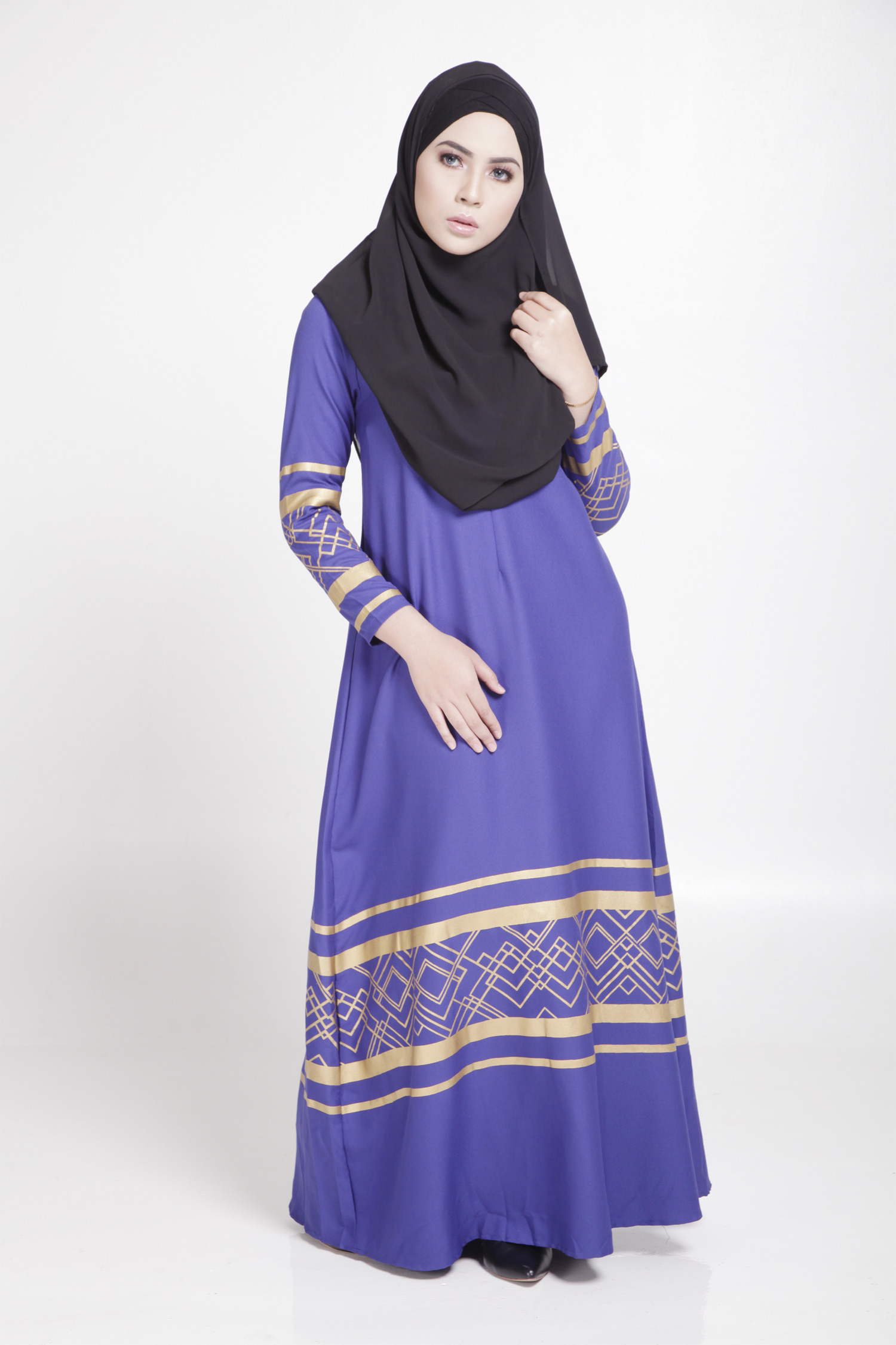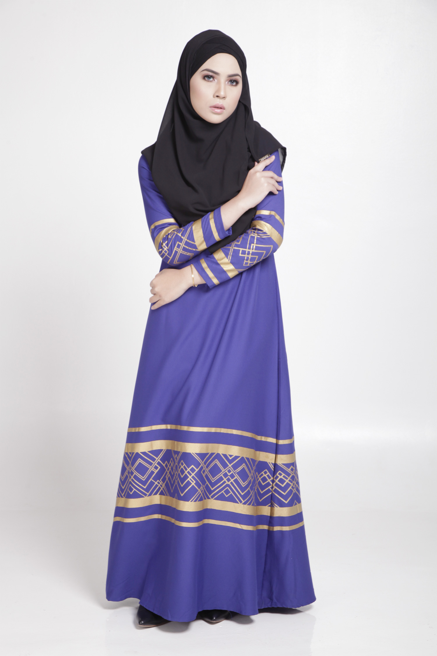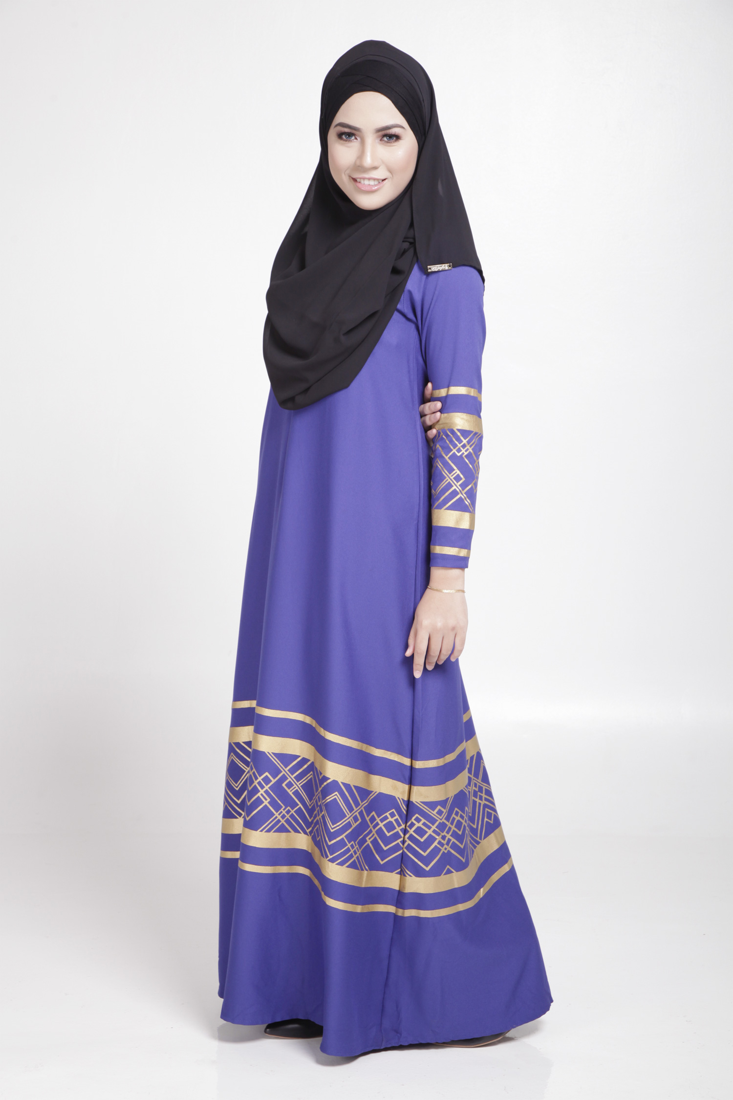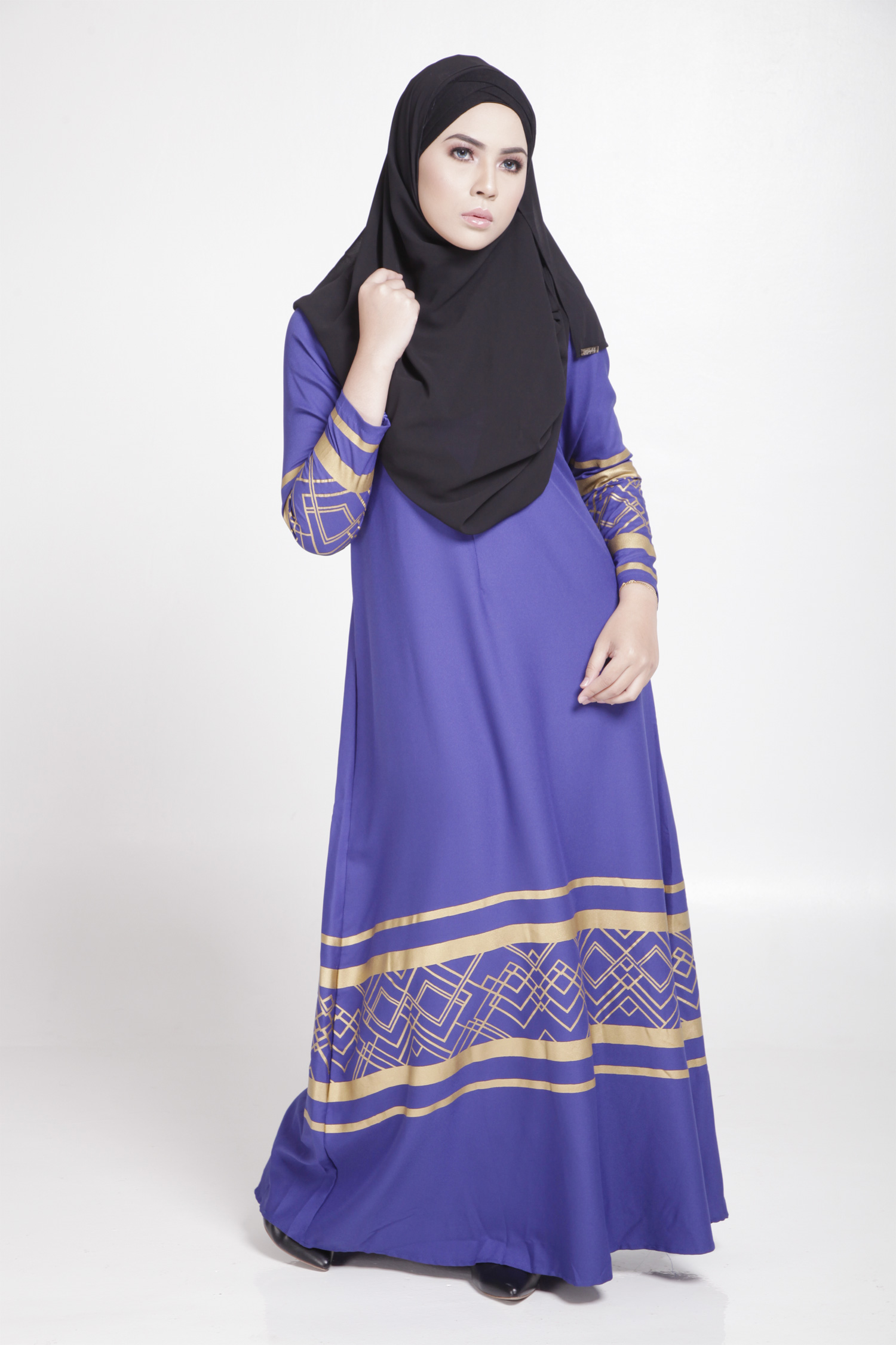 MODERN LONG SLEEVE GOLD CURVE JUBAH DRESS (BLUE, SIZE M)