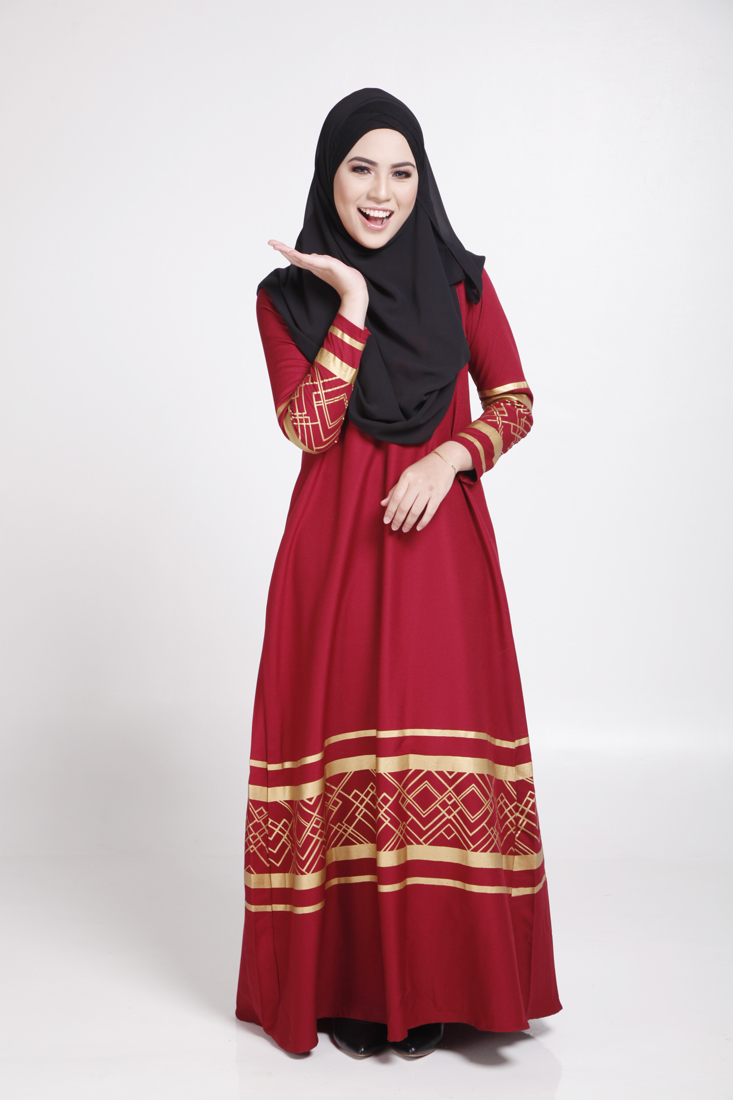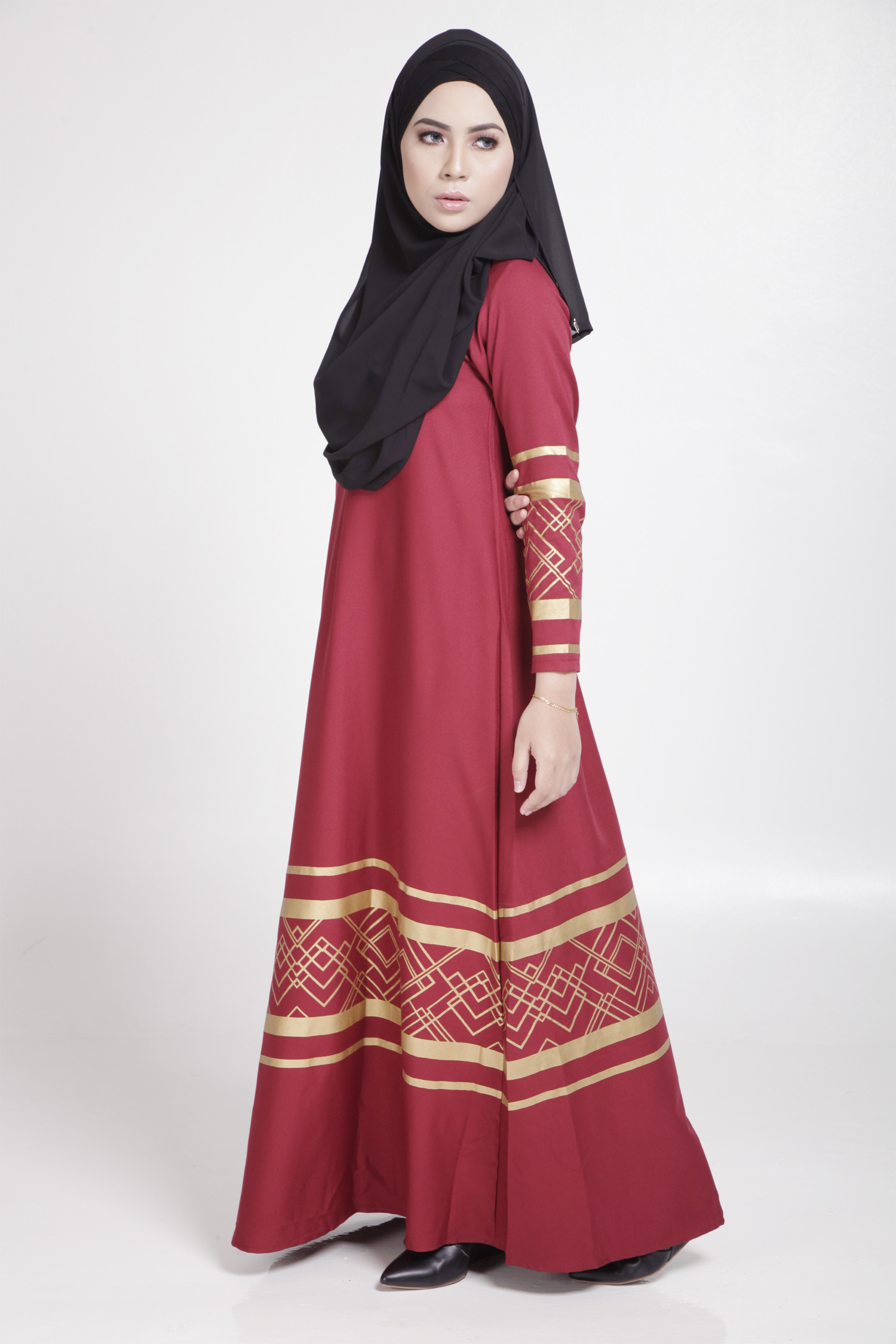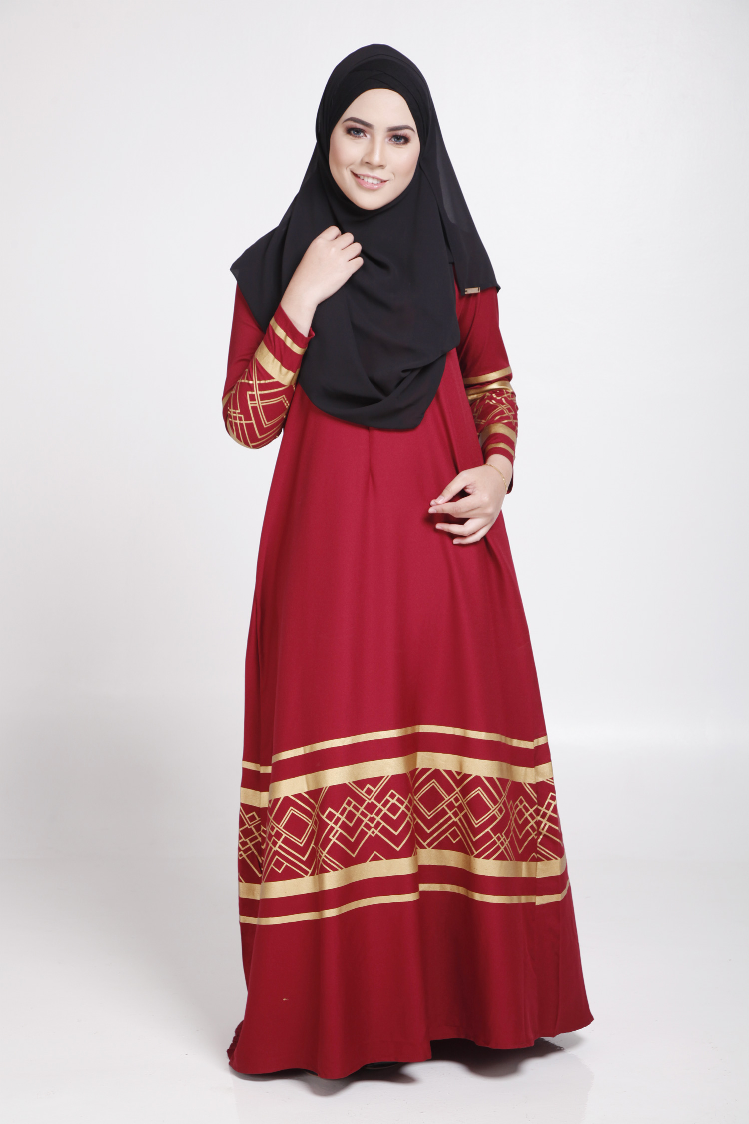 MODERN LONG SLEEVE GOLD CURVE JUBAH DRESS (RED, SIZE M)