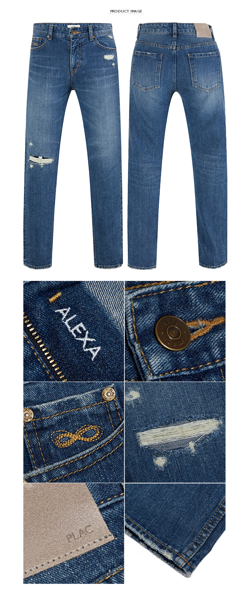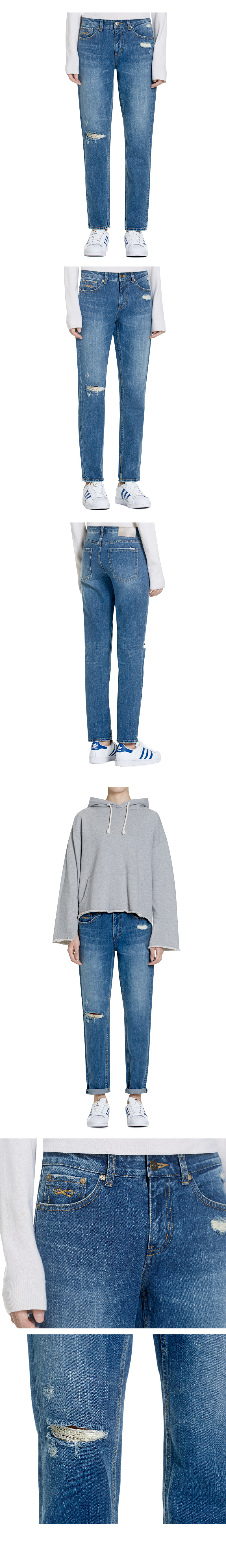 - 빈티지한 중청컬러의 보이프렌드 핏 - 13 OZ 대의 난스판 원단 사용 - 무릎의 오픈구제로 디테일성을 더함 - 롤업시 밑단 옆선의 체인작업으로 세심한 디자인을 함 - COTTON 100% - 13 OZ | |