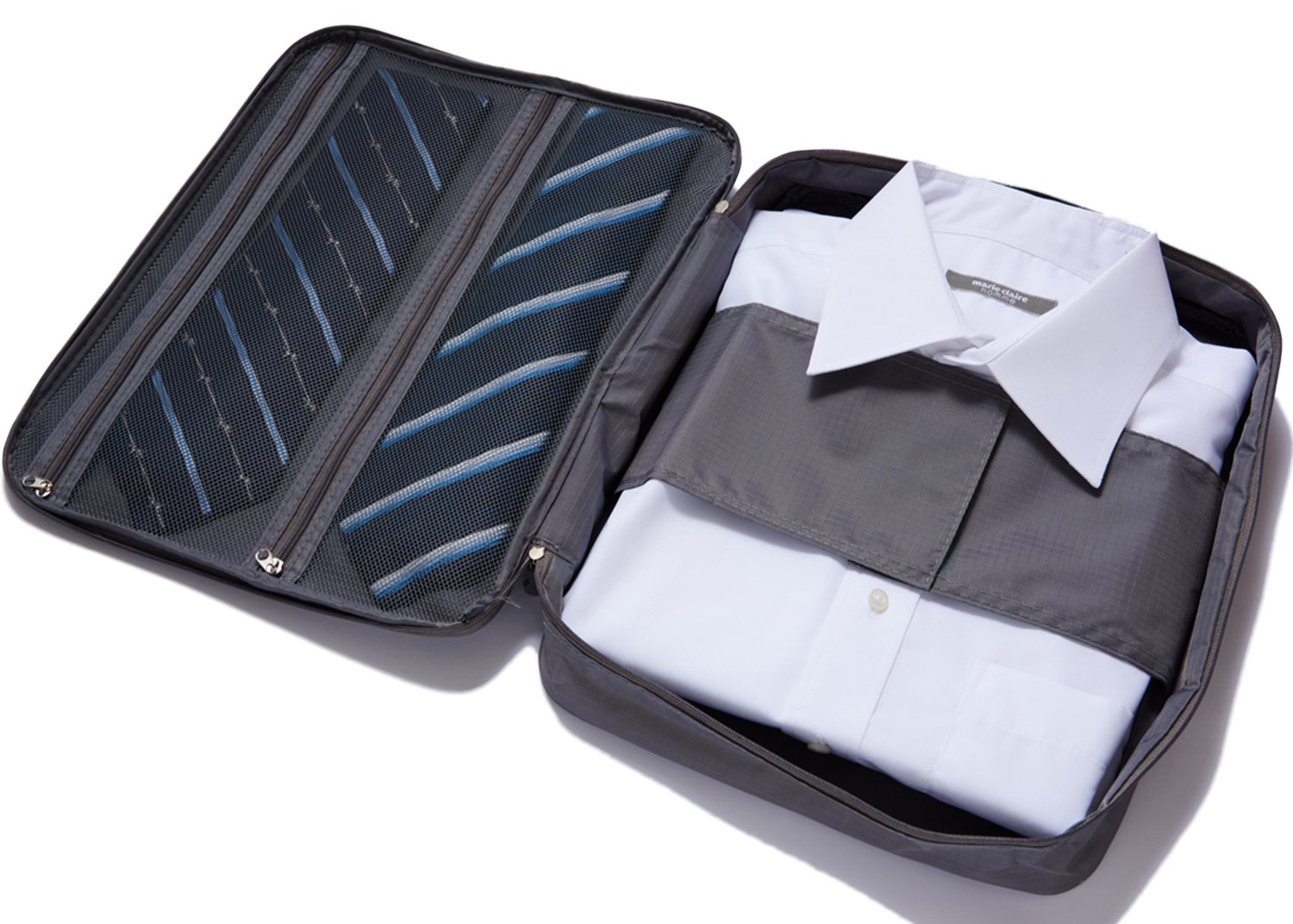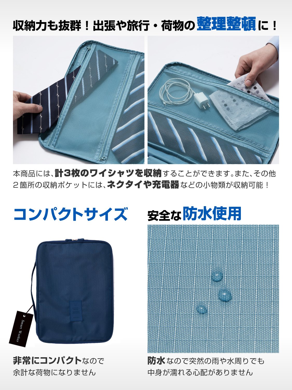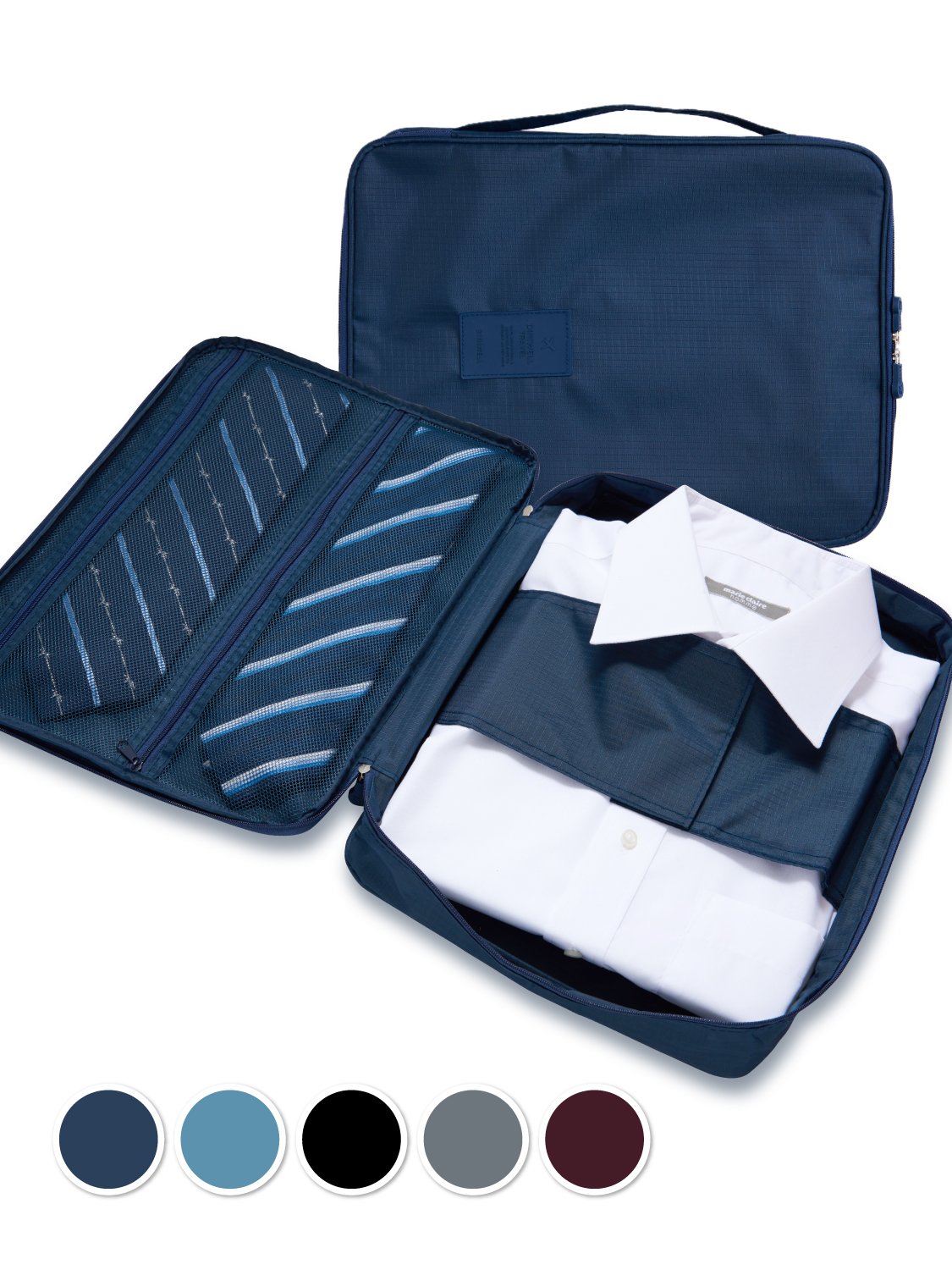 In addition, other two storage pockets can store small items such as ties and chargers.