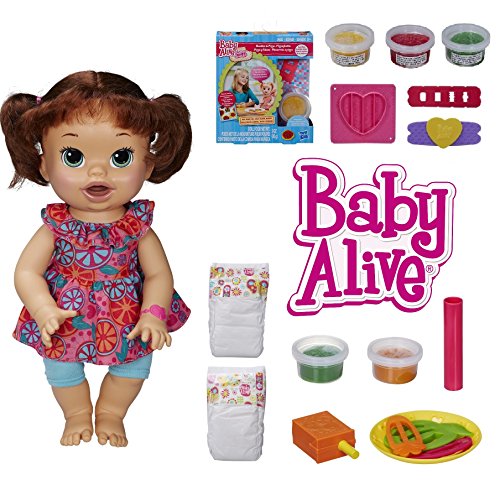 -. Feature : Have the fun of real babies with the Snackin' Sara doll / Little girls can make snacks with the reusable doll food and 3 shaping tools. She can feed the doll from the plate and pretend juice box. / Doll says phrases in English and Spanish / Includes doll, outfit, 2 diapers, two 1-ounce containers of reusable doll food, 3 shaping tools, 1 roller, plate, pretend juice box, and instructions. / Bonus Noodles & Pizza Snack Pack: Make pretend noodles and pizza with the reusable doll feed in this pack - just roll, shape with the cutters and feed.