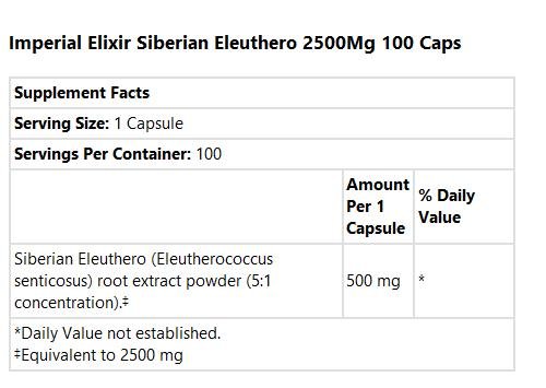 Studio : Imperial Elixir (Ginseng Company) Publisher : Imperial Elixir (Ginseng Company) Binding : Health and Beauty Product Description Siberian Ginseng 2500mg 100 CapsuleProduct Description (Eleutherococcus senticosus) Used by millions of people, worldwide, to support stamina and vitality and to fight stress. Made from pure 51 extract powder for maximum absorption and effectiveness. (See sidebar to the left.) Siberian Eleuthero 2500 - Each capsule contains 500mg of Siberian Eleuthero 51 extract powder, the equivalent of 2500mg of raw material. 100 capsules per bottle.