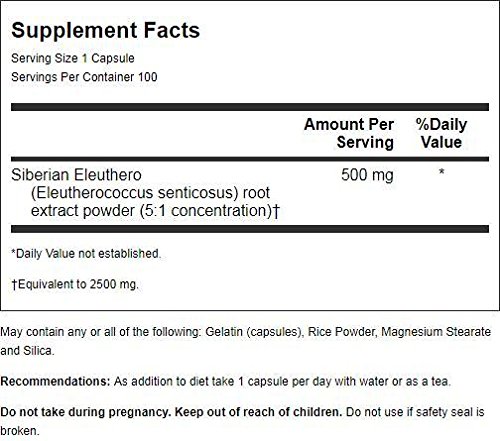 Suggested Use As a dietary supplement as addition to diet take 1 capsule per day with water or as a tea - Or as directed by your healthcare professional. Supplement FactsServing Size: 1 CapsuleServings Per Container: 100Amount Per Serving% Daily Value***Siberian Eleuthero (Eleutherococcus senticosus) root extract powder (5 to 1 concentration).500 mg ***Percent Daily Values are based on a 2,000 calorie diet