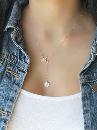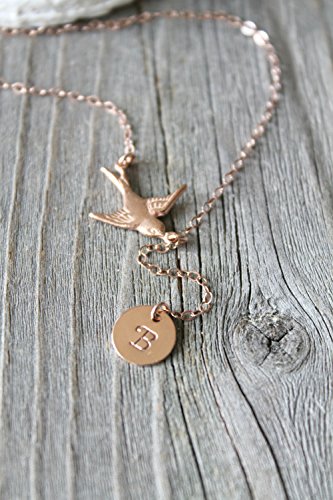 -. Title : 14k rose gold filled Swallow Bird Lariat necklace, custom stamped initial disc, personalized monogram letter, pink gold, bridesmaids gift