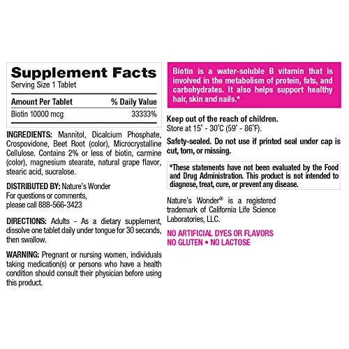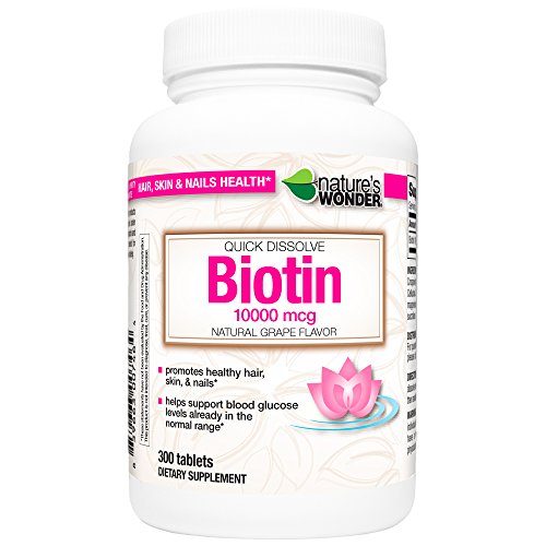 Product DescriptionNature's Wonder Biotin 10000mcg Quick Dissolve. Natural grape flavored dissolvable tablet to support healthy hair, skin and nails.0
