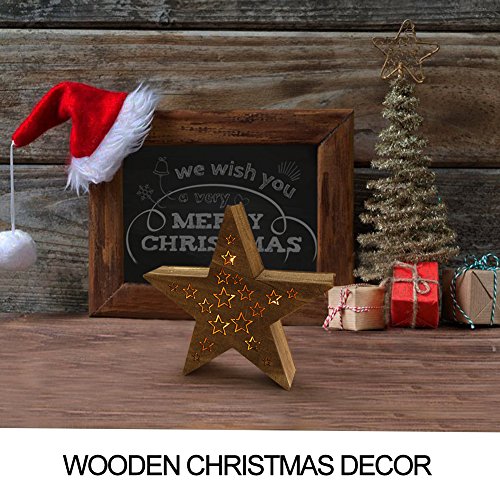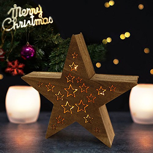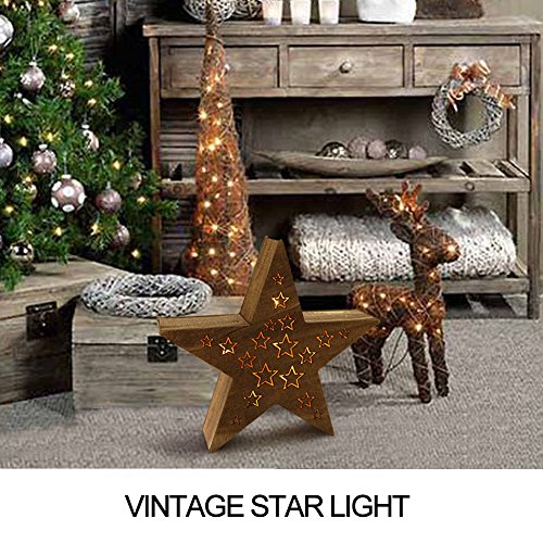 LIGHT UP YOUR CHRISTMAS WITH THIS DIMENSIONAL WOODEN STAR, DAY AND NIGHT - 14" Wide 3D wooden five pointed star shape, decorated by 10 white LED bulbs & cutout stars, blends well with your surrounding decorations, gives a vintage flair & natural beauty - At night, LED bulbs emit warm white soft glow, casting intricate star shadows through cutout stars; creates a cozy festival ambiance - Three-dimensional star light perfectly fills any room with a nature-inspired, holiday glow during Christmas.