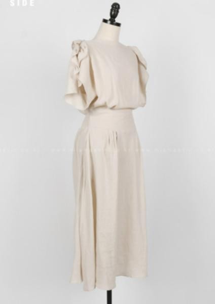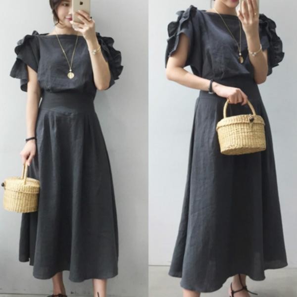 商品詳細エレガント 肩フリル 半袖 ボートネック ワンピースサイズ展開は:FREEになります。 採寸は下記通りです、ご参考ください。 ※実寸を記載しておりますので、お手持ちのお洋服と 比較いただけると、サイズ選びの目安になります。※着丈の参考に ⇒ 身長別着丈ガイド! 【サイズ(cm)】 着丈 116.0cm 袖丈 25.5cm ウエスト 67.0cm 【カラー】 チャコール 【素材】 リネン100%