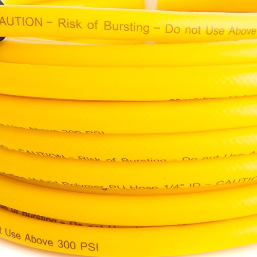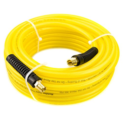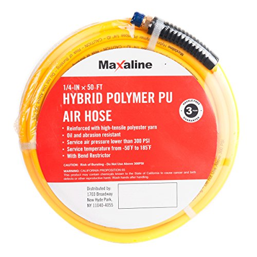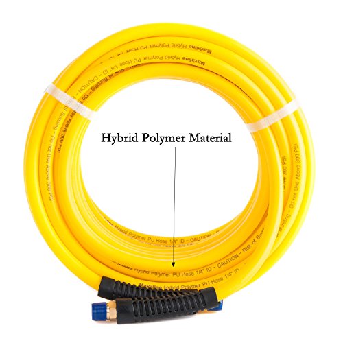 Maxaline Non-Kinking Hybrid Polymer & PU Air Hose 1/4" x 50' 300 PSI With 1/4" MNPT Brass Ends and Bend Restrictor Yellow