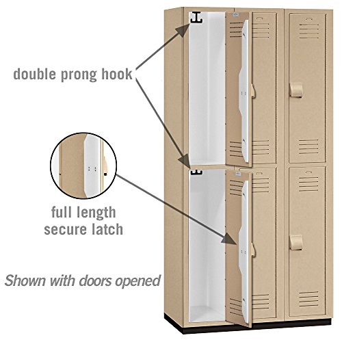 42000 Series Double Tier Heavy Duty Plastic Lockers are constructed of water resistant 1/2" thick high density polyethylene (HDPE). Ideal for pool areas, gyms, restaurants, sports and athletic facilities and other high humidity environments. Available in a gray, tan or blue finish. Units include a 3" high x 15" deep black plastic base and are 6 feet high (add 3" for base) and 18" deep. Units have compartment sizes that are 10 1/2" wide and 35" high. Available as 1 wide or 3 wide units. 1 wide units come fully assembled while 3 wide units require minor assembly. Salsbury Industries is an ISO 9001: 2008 certified company and has excelled in the field of manufacturing since 1936.Feature