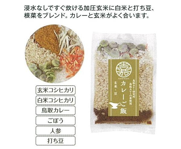 「嘉右衛門・新潟産コシヒカリ」と鳥取カレー研究所の「鳥取カレー」をブレンドしました。お水を注いで炊くだけの、お子様からお年寄りまで楽しめる天然素材の優しいカレーです。肉や野菜などのトッピングも楽しいです。 |