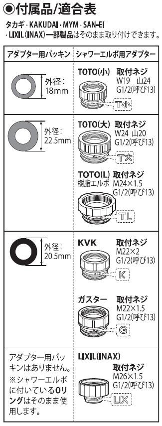 | セット内容 | シャワーヘッド シャワーホース アダプター用パッキン:3種 シャワーエルボ用アダプター:6種 保証書(保証期間:2年) |