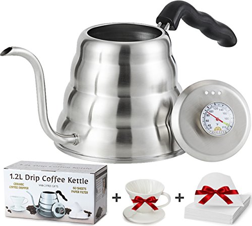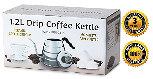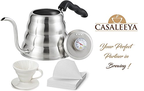 -. Brand : casaleeya -. Color : Silver -. EAN : 0817279020024 -. Feature : QUALITY ASSURED - Made of high quality 304/201 stainless steel that will not discolor or rust. Features strong handle and tight-fitting top. / PREMIUM THERMOMETER - Know when the water reaches the exact temperature you need for your pour-over coffee or tea with zero boiling over. / MULTIPLE CUPS - Enjoy 1.2 Liters of perfect temp boiling water (4-5 cups). Kettle features easy-pour spout for smooth & exact pours. / 1 YEAR GUARANTEE - Let us prove to you that this is the last gooseneck kettle you'll buy. Your order is backed by a one year money back guarantee. / SAVE MONEY - A ceramic coffee dripper, plus a pack of 60 one-time-use filter bags for coffee are included in your purchase today. -. Label : casaleeya -. Manufacturer : casaleeya -. Model : CK-001 -. MPN : CK-001 -. PartNumber : CK-001 -. ProductGroup : Kitchen -. ProductTypeName : KITCHEN -. Publisher : casaleeya -. Studio : casaleeya -. Title : CASALEEYA 1.2 Liter Stainless Steel Gooseneck Kettle with Built-in Thermometer, 60 Disposable Filter Bags, Ceramic Dripper and Handle -. UPC : 817279020024 -. Warranty : Manufacturer warranty for 3 years from date of purchase