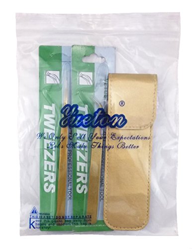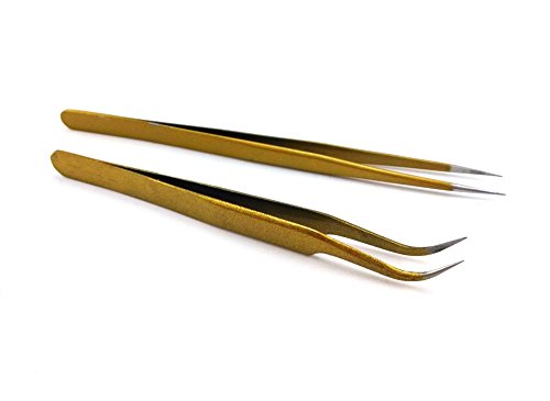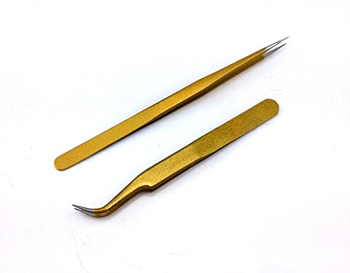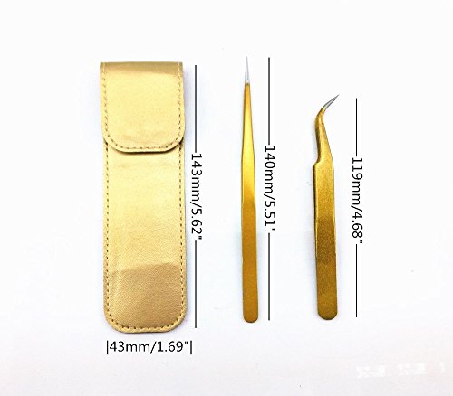 yueton 2pcs Gold Color Coated Stainless Steel Straight and Curved Head Tweezers with Leather Case for Eyelash Extension