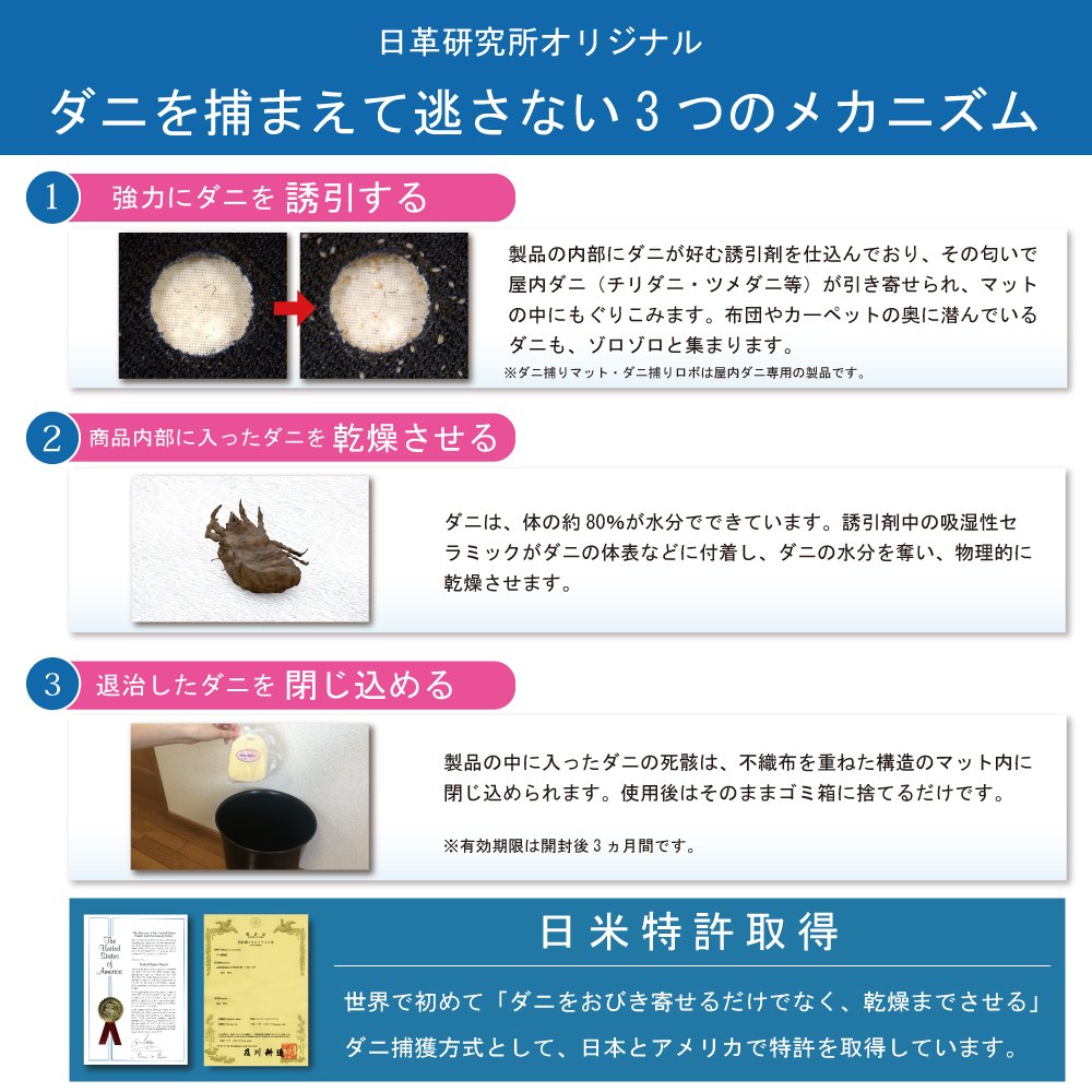 For the first time in the world, the Japan Academy of Informatics got a patent in Japan and the United States as a tick capturing system that "not only identifies the scent that the mite likes, but also makes it dry".