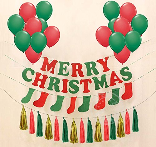 - 2.Including: 1pc MERRY CHRISTMAS BANNER ,2 bags of red and green latex balloons,1pc foil tassel banner.