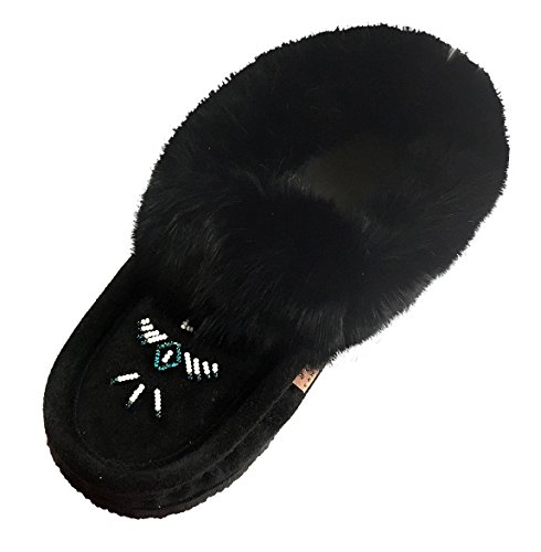 -. Binding : Apparel -. Brand : Laurentian Chief -. Color : Black -. Department : womens -. Feature : Thunderbird Beaded Design on Vamp / Thick Fleece Lining & Durable Crepe Sole / Real Rabbit Fur Collar / Canadian Handmade by Laurentian Chief / Fit True to Size - For Half Sizes Go Down (8½ order size 8) -. Label : Eugene Cloutier Inc. -. Manufacturer : Eugene Cloutier Inc. -. ProductGroup : Shoes -. ProductTypeName : SHOES -. Publisher : Eugene Cloutier Inc. -. Studio : Eugene Cloutier Inc. -. Title : Laurentian Chief Women's Black Suede Slippers with Rabbit Fur Collar Moccasins