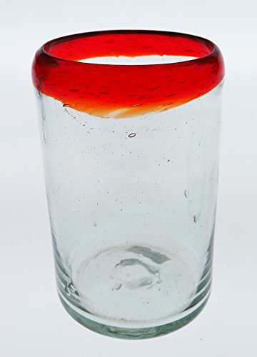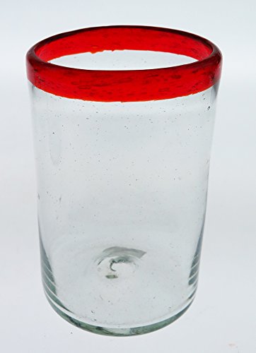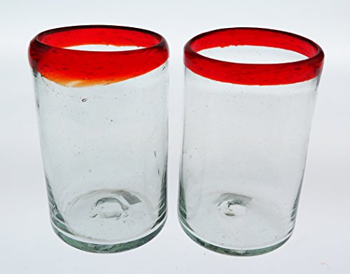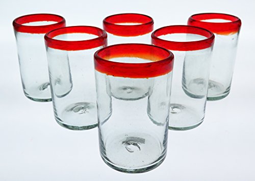 Studio : Eye4Art Publisher : Eye4Art Product Description Every day is a fiesta whether serving lemonade or ice tea or that special drink. These glasses are crafted in Mexico from recycled glass. Decorated with a red rim that coordinate beautifully with any festive setting. Because they are handmade dimensions may vary slightly. Sturdy enough for everyday use. Mouth-blown lead-free glass. Dishwasher Safe Size: approximately 5 inches high 3 inches wide and holds around 16 oz. Care instructions: Our Mexican Glassware is individually mouth blown, hand formed and made from recycled glass. Trapped bubbles and slight variations in form, capacity and color are natural and charming features of the glassware. Although it is quite durable, this glass is not tempered so some extra care is necessary. A cooling-off period is essential after the glassware is removed from the dishwasher. Extreme temperature changes may cause thermal shock and cracking. This glassware is not suitable for serving hot beverages. 0