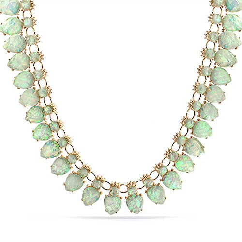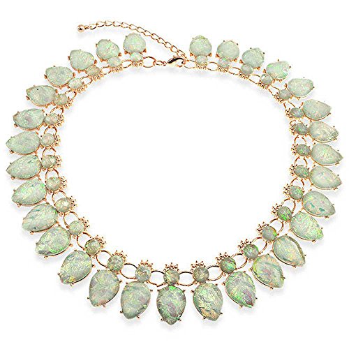 Our contemporary and eye catching jewelry make a big statement. You can turn an ordinary ensemble into something completely original with this on trend necklace and earrings set. The perfect accessory for any woman who wants to add a little sparkle to her look, our Simulated Opalite jewelry is a sensational choice. Made from luminescent links of shimmering Simulated Opalite and gold plating for a very pretty look. Each of the teardrops on both the links and on the earrings measure approximately 20mm and sit just beneath an 8mm round Simulated Opalite stone. Both stones are 4 prong set and feature a gold plated crown design at the top for a bold and beautiful look you will love.Feature
