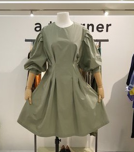 카키색상의 원피스로 여성스러운 분위기를 느낄 수 있습니다. 네크 라인과 소매 장식으로 더욱 하늘하늘한 감성을 엿볼 수 있는 아이템 입니다.
