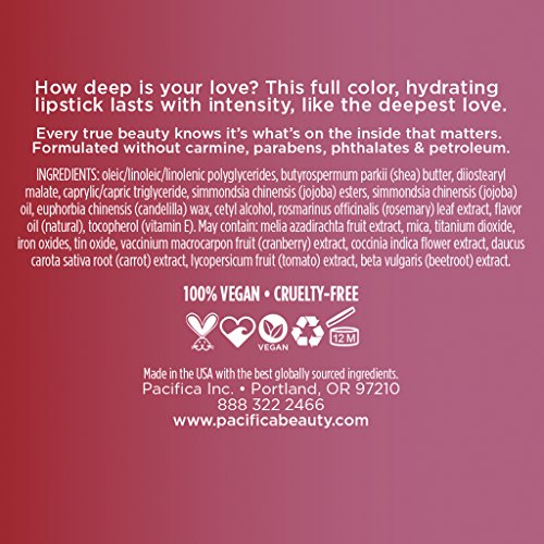 Pacifica's Devocean Lipstick is a full color, 100% vegan, hydrating natural lipstick that lasts with intensity, like the deepest love. Creamy hydration, highly pigmented, and chocked full of benefits that nourish and love your lips. All Pacifica products are 100% vegan and cruelty-free.