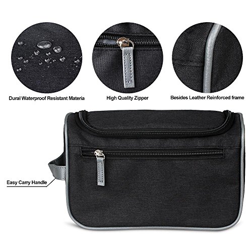 - [Multi-functional Design] The toilet bag desgined with built-in top hook for hanging in bathroom, towel rack or anywhere you want to easily view and access your organized items. The borders of toiletries bag are with leather material to reinforce the bag to be sturdy, and beside leather handle is convenient for handy carrying. A front zipper pocket outside also can provide extra storage when needed.