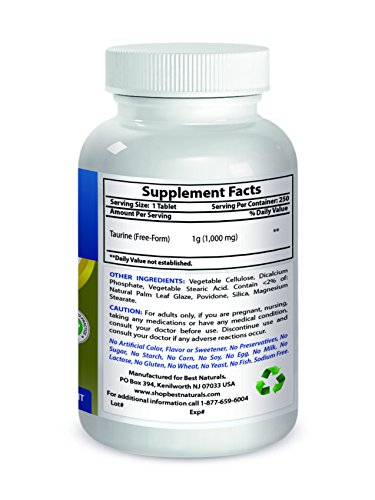 -. Binding : Health and Beauty -. Brand : Best Naturals -. EAN : 0817716014210 -. Feature : Nervous System Health* / Cardiovascular Health* / Supports helthy liver function* / Supports healthy digestive system* / All Best Naturals products are manufactured in accordance with Good Manufacturing Practices (GMP), among the highest standards in the world -- Proudly Made in USA -- Purity & Potency Guaranteed -. IsAdultProduct : 0 -. Label : Best Naturals -. Manufacturer : Best Naturals -. ProductGroup : Health and Beauty -. ProductTypeName : HEALTH_PERSONAL_CARE -. Publisher : Best Naturals -. Studio : Best Naturals -. Title : Best Naturals Taurine 1000 mg 250 Tablets -. UPC : 817716014210