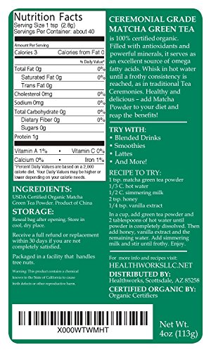-. Binding : Grocery -. Brand : Healthworks -. EAN : 0881314623747 -. Feature : A drink you will surely love - Matchaworks USDA Certified Organic Ceremonial Matcha Green Tea Powder is consciously harvested and handcrafted, with the highest-quality tea leaves, to provide a finely grounded, brilliant green powder. / Easy to use - Matcha powder is simply whisked into hot water making it a simple way to add powerful health benefits to your diet. When you drink matcha you ingest the entire tea leaf and receive 100% of the nutrients. / Matcha delivers a mega dose of antioxidants with every glass. It is also rich in EGCg, fiber, chlorophyll, vitamin C, selenium, chromium, zinc, magnesium & more! / A cup of our highest grade Matcha tea will bring zen and outstanding flavor to your everyday life. / Matchaworks by Healthworks Customer Satisfaction Promise: Get a full refund or replacement within 30 days if you are not completely satisfied. -. IsAdultProduct : 0 -. Label : Healthworks -. Manufacturer : Healthworks -. NumberOfItems : 1 -. ProductGroup : Grocery -. ProductTypeName : GROCERY -. Publisher : Healthworks -. Size : Ceremonial Grade 4oz -. Studio : Healthworks -. Title : Matchaworks Matcha Green Tea Powder Ceremonial Grade Raw Organic, 4 Ounce -. UPC : 881314623747