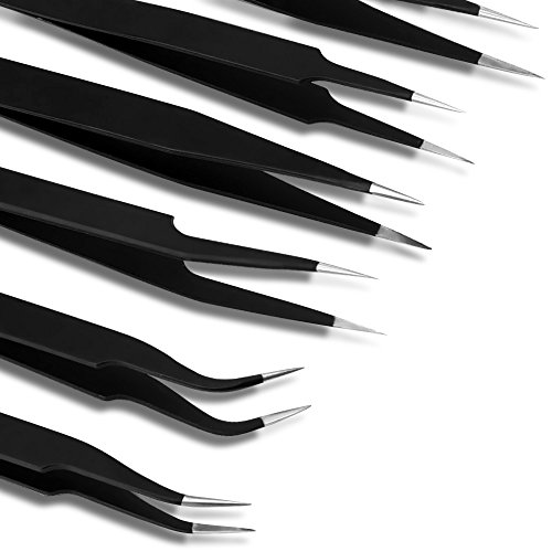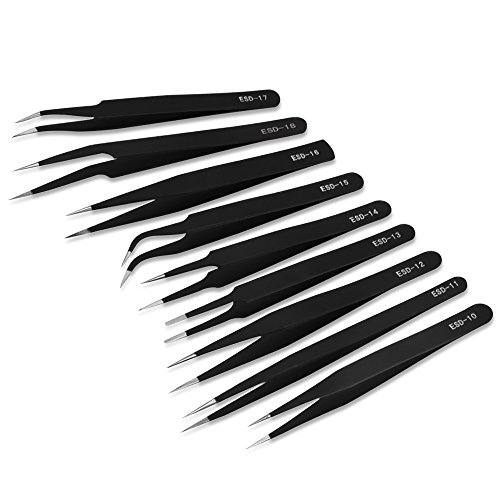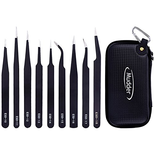 Mudder 9 Pieces Anti-static ESD Tweezers Kit Non-magnetic ESD Tweezers with Storage Bag