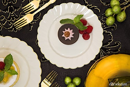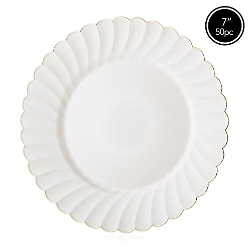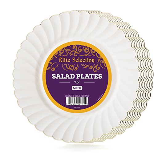 Elite Selection Pack Of 50 Salad / Dessert Disposable Party Plastic Plates Cream Ivory Color With Gold Flower Rim 7.5-Inch