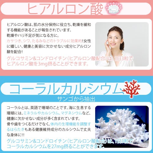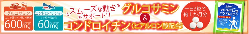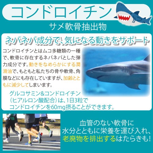 グルコサミン&コンドロイチン(ヒアルロン酸配合)は、1日3粒でコンドロイチンを60mg摂ることができます。