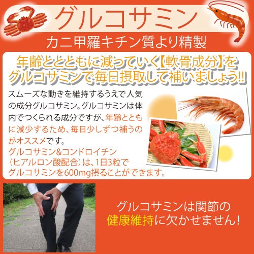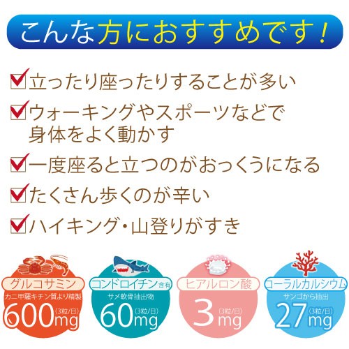 ●加齢とともに減少する軟骨成分であるグルコサミンや、クッションの役割をしているコンドロイチンを手軽に摂取できます!