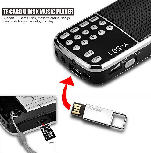 -. Feature : MP3 Music Player support for the TF Card / USB Disk; With standard 3.5mm jack, available for earphones to listen to music anywhere; Large LED Screen Display function; Built-in Rechargeable Li-ion Battery. / So convenient with the emergency flashlight feature; It will come in handy while walking outdoor at night or power emergencies. / Pocket Size and Slim Design; It's Only 1 inch thinckness of this Radio's body, refined and elegant, easy carrying / Built-in Rechargeable Lithium battery 3.7V 800mAh,Playing time up to 2-4 hours in once charge / Super Radio Effect and Amazing Sound Quality,Built-in the magnetic speakers, enjoy the powerful bass and treble fullness while listening to music