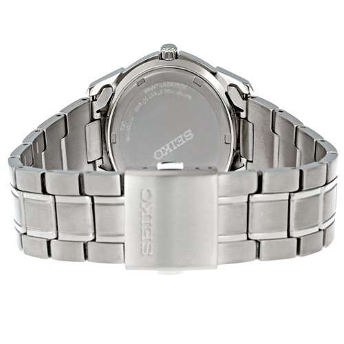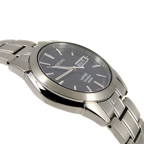 Titanium case with a titanium bracelet. Fixed titanium bezel. Blue dial with luminous hands and index hour markers. Minute markers around the outer rim. Luminiscent hands and markers. Day of the week and date appears at the 3 o'clock position. Quartz movement. Scratch resistant hardlex crystal. Solid case back. Case diameter: 37 mm. Case thickness: 8 mm. fold over clasp with double push button safety. Water resistant at 100 meters/ 330 feet. Functions: hours, minutes, seconds, calendar. Seiko Blue Dial Titanium Mens Watch SGG729.Feature