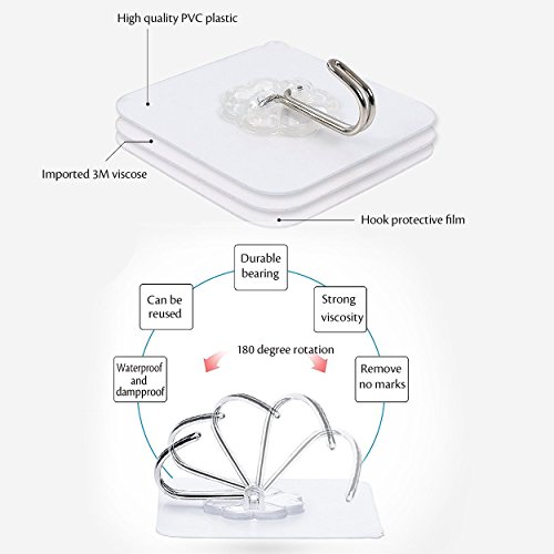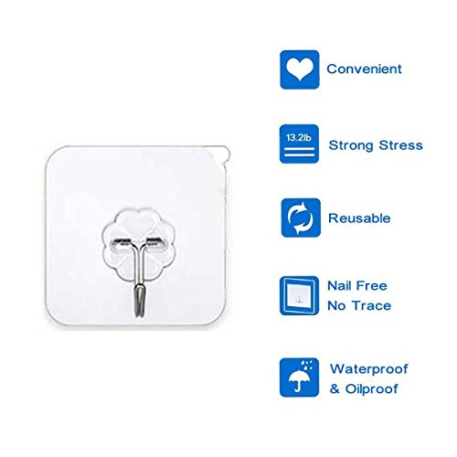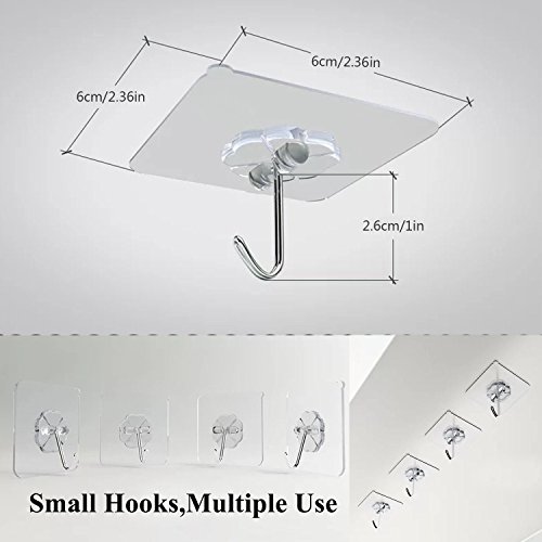 - 【REUSABLE STEALTH ADHESIVE HOOKS】:Unique transparent design makes it almost invisible which is quite suitable for nice home decoration,which won't affect the beauty of your wall. What's more,Small hook has great capability and Strong bearing weight,heavy load of 10kg/22lb. It 's no easy falling off, which Can be washed and reused, dried with a hair dryer can be used repeatedly. Good elasticity and easy to restore after bending.Durable and Reusable,no need frequent buying.