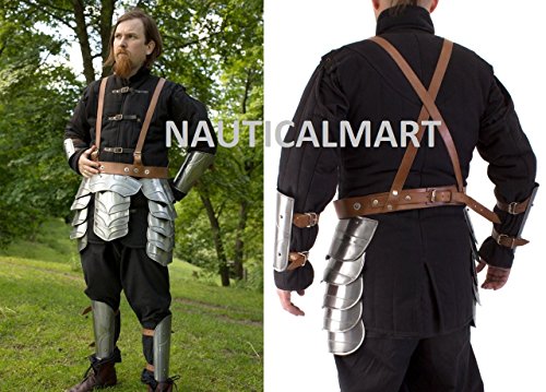 Product Description The Upper Leg Protection (or tassets) King helps to protect the thighs and the groin from sword blows and other impacts. Two sets of steel plates protect the hips and the outer thighs, a third set of smaller plates protects the groin and parts of the inner thighs. They are made from 1 mm thick steel with no sharp edges and therefore are safe for LARP weapons. It is worn with a leather belt and additionally over your shoulders with belt suspenders. What makes these piece of armour so special is the unique design that is kind of similar to a cross and makes the armour look quite classy. A perfect addition to your LARP outfit if you want to play the character of a king or his guards, but can of course be worn with many other characters, too. 0