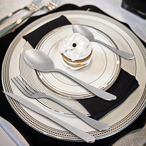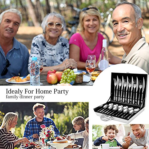 Specifications: Package weight: 70 oz Material: Stainless steel Package dimensions: 13.58(L) × 10.24(W) × 1.96(H) inch Are you looking for an ideal gift for a housewarming party? Are you looking for tableware sets for home use, camping picnic, or a party ? Then, just give GYY flatware sets a try ! Product Highlights: №1 All the 24 pcs flatware are placed tightly and orderly with elastic bands; №2 GYY 24 pieces exquisite flatware sets are made of 18/10 Asian stainless steel; №3 Elongated handles make them very comfortable for both adults and children; №4 Simple elegant appearance can easily match with all your existing tableware with advanced mirror polished craft; №5 This luxury case of tableware is convenient enough for easy carry while sturdy enough for everyday use, elegant enough for a party; This GYY 24 pieces dinnerware set comes with an exquisite gold gift box, which can be an ideal gift for a housewarming party, or mother's day gift for your mom. Package Includes: 1 × flatware sets package box ( Silvery gift box ) 6 × dinner fork 6 × dinner steak knives 6 × medium dinner spoons 6 × teaspoons Notices: Please keep them from children in case of unexpected accidents; This cutlery set is dishwasher safe, you can clean it with dishwasher; Please keep them dry and clean after every use to maintain their durability. 0
