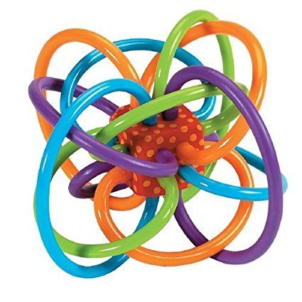 This brightly colored toy features interlocking plastic loops in a range of colors: purple, blue, orange and green. The bright colors of these loops will instantly appeal to any baby. The center part of the toy serves as the rattle, another feature that will surely entertain your child. Each loop is safe to chew on, made of teethable plastic.Feature