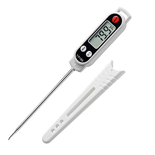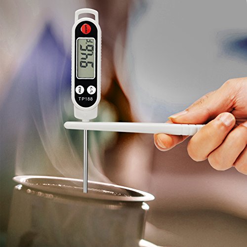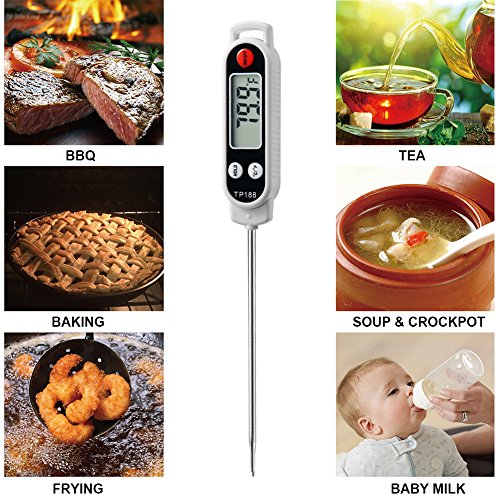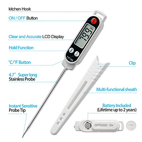 - EASY TO USE & LIFETIME WARRANTY Digital Probe Thermometer is easy to use. Simply insert probe into your food or liquid and read the temperature. provide 7*24 customer service. Please contact us for any problems freely! (LR44/AG13 button battery included.Auto-shut off if readout stays on for 10 minutes)