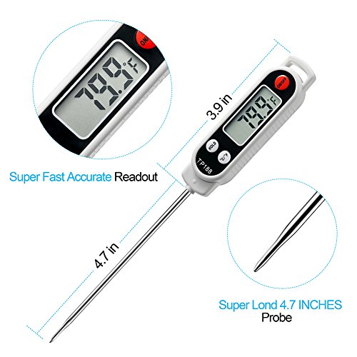 - SUPER LONG STAINLESS STEEL PROBE This Cooking thermometer has 4.7" Super Long food grade stainless steel probe with Step-down Tip design to display temp faster. When testing your grilling fry steak, boiling water, hot milk, or BBQ meat, Not burn your fingers any more!
