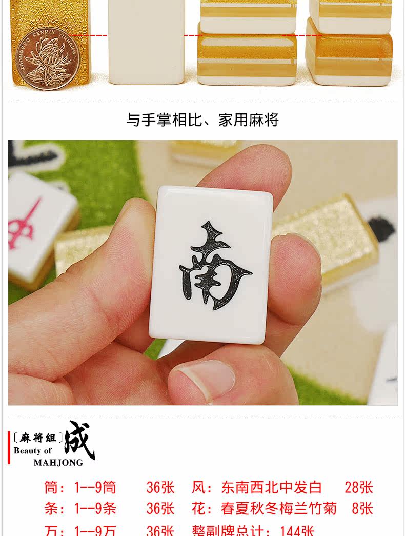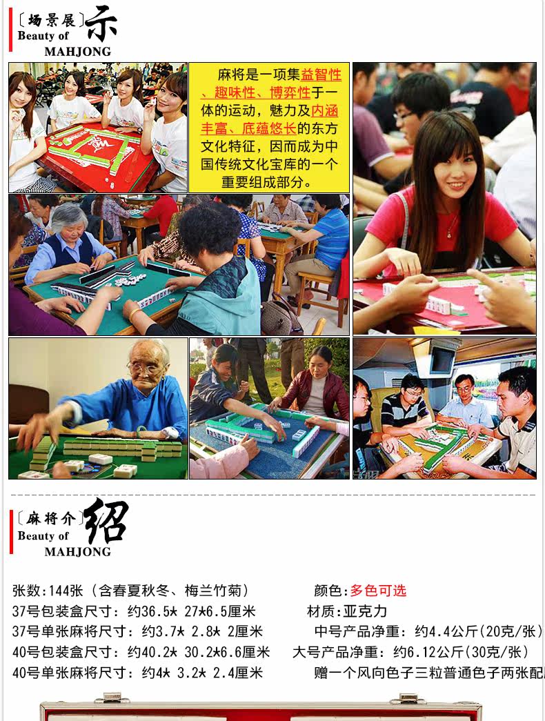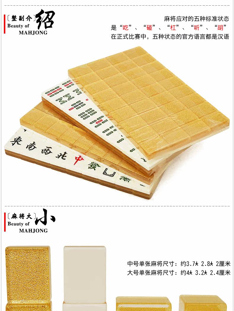 Medium leaflet Mahjong size: about 3.7 * 2.8 * 2 cm medium product weight: about 4.4 kg (20 g / Zhang)