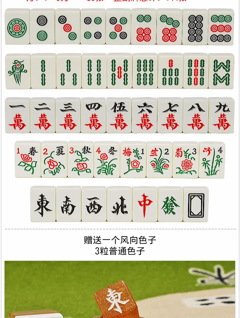 大号单张麻将尺寸: 约3.9* 3* 2.2厘米 赠一个风向色子三粒普通色子两张配牌
