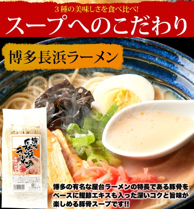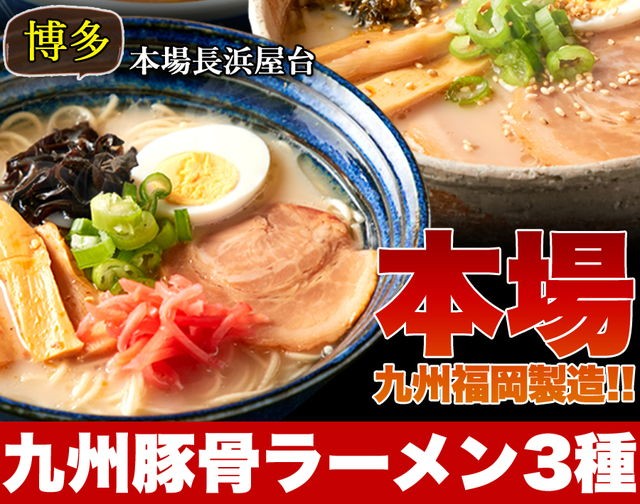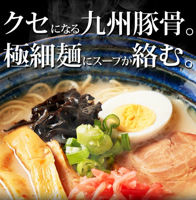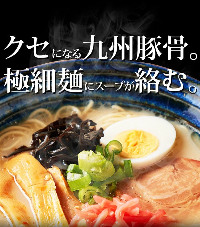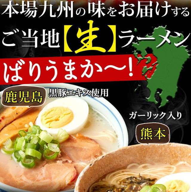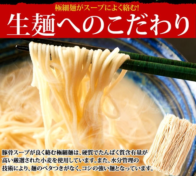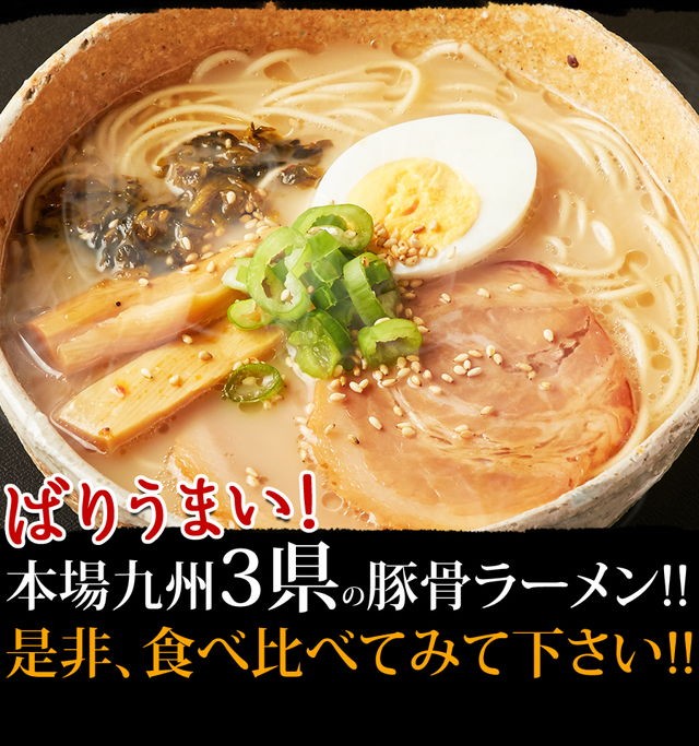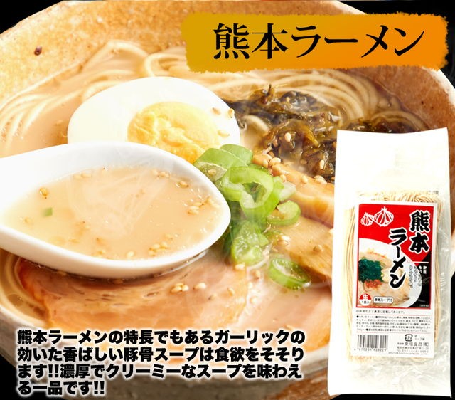 | 原材料名 | 【めん】小麦粉、食塩、植物油、酒精、ソルビット、かんすい、焼成(Ca) 【博多スープ】ポークエキス、ラード、鰹節エキス、醤油、食塩、香辛料、食用植物油、チキン油、砂糖、調味料(アミノ酸等)、増粘剤(キサンタンガム)、(原材料の一部に乳、小麦を含む) 【熊本スープ】ポークエキス、醤油、ラード、鰹節エキス、食塩、香辛料、砂糖、食用植物油脂、チキン油、調味料(アミノ酸等)、増粘剤(キサンタンガム)、(原材料の一部に小麦、乳を含む) 【鹿児島スープ】ポークエキス、食塩、醤油、ラード、チキン油、野菜エキス、アミノ酸液、香辛料、黒豚エキス、風味油(長ネギ、長ネギシーズニングオイル)、豚脂、砂糖、発酵調味料、チキンエキス、でん粉、食物せんい、酵母エキス、調味料(アミノ酸等)、増粘多糖類、(原材料の一部に小麦を含む) |