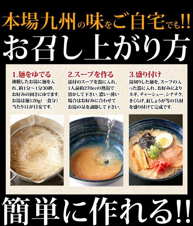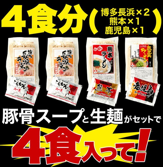 | 内容量 | 【麺】90g×4袋、【博多スープ】37g×2袋、【熊本スープ】40g×1袋、【鹿児島スープ】35g×1袋 |