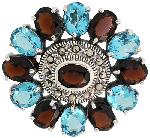 -. Title : Sterling Silver Marcasite Large Flower Brooch Pin w/ Oval Cut Garnet & Blue Topaz Stones, 1 9/16 in. (40mm)