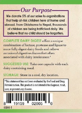 Why We Created Complete Dairy Digest: It's difficult to completely cut all of the dairy from one's diet. It's sometimes hiding in food that restaurants prepare. That's why we created Complete Dairy Digest. Each capsule delivers lactase to aid digestion of milk sugar (lactose), lipase for fat digestion, over 1 Billion CFU of probiotics, and a protease. Complete Dairy Digest helps support digestion of milk sugar, milk protein, and milk fat and helps to alleviate the occasional discomfort experienced by individuals sensitive to dairy products.*Quality and Satisfaction Guaranteed: Our Complete Dairy Digest supplement is manufactured in the USA at a NSF and cGMP certified facility. If you are not 100% satisfied, we will refund your purchase, up to one bottle per customer.