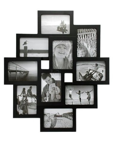Crafted of wood, the frame has 10 openings for photos or mementoes