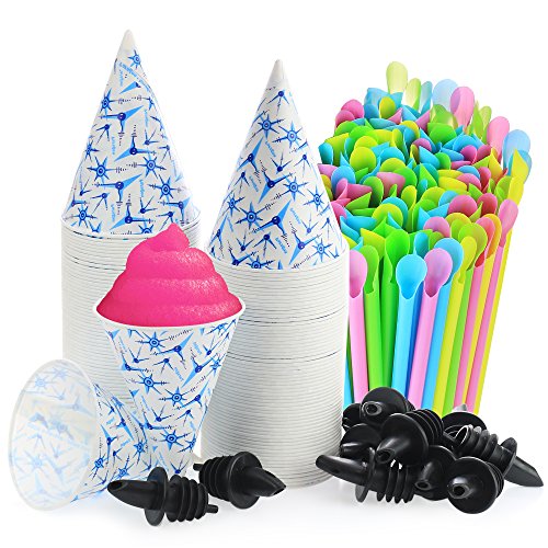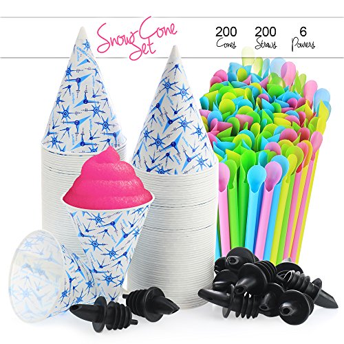 - A snow cone party set, 200 heavy duty cups, And 200 bright spoon straws PLUS 6 Free Flow Pourers,