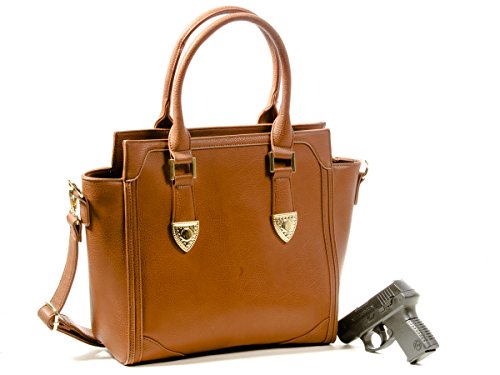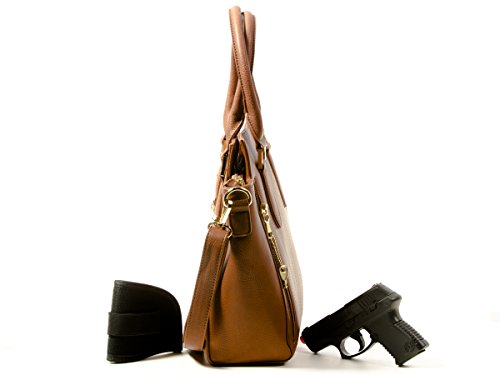 Product Description This is a very nice faux leather concealed carry handgun purse. This handbag has a two zippers on the back so you can draw from either side and wear your purse on either shoulder. The gun pocket has a velcro holster in it and velcro attachments on each side of the gun pocket so you can put you gun in any position you like. It's a big pocket measuring with two 9" zippers on each side x 12" wide and will fit even large sized handguns. There is a detachable, adjustable, crossbody strap and two 7" drop rolled handles. Inside the bag is a big open space with 2 open pockets on the front wall and the back wall has a pretty neat setup where there are actually 2 zipper pockets attached to it with an open pocket in the center, this way the center of your purse is an open design and easier to find stuff in. 0