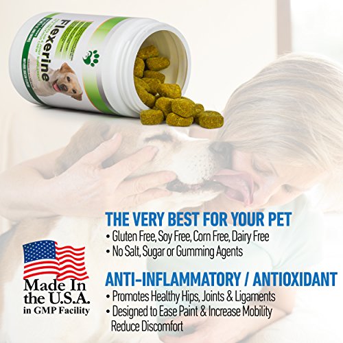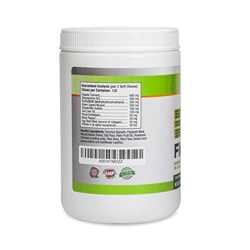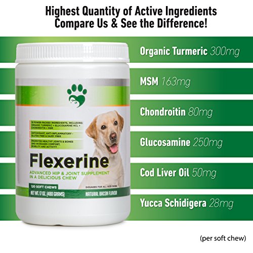 The very best joint relief for dogs is here! With ten power-packed ingredients, Flexerine is formulated to provide joint relief for dogs of all sizes. Flexerine is the #1 dog supplement that promotes healthy joints & bones and increases comfort, mobility and activity in your pet. Flexerine uses a unique, no-heat & no-water production process that maintains the ingredient integrity and quality of our delicious soft chew hip and joint dog treats. Unlike other brands that make joint relief for dogs, Flexerine contains: No Corn, No Wheat, No Soy, No Sugars, Salts or Gumming Agents. Flexerine is all-natural and 100% Gluten Free & Dairy Free As the #1 joint relief for dogs, Flexerine is manufactured in the USA in a GMP facility. GMP refers to the Good Manufacturing Practice Regulations promulgated by the US Food and Drug Administration under the authority of the Federal Food, Drug, and Cosmetic Act. Compare our joint relief for dogs with others and see your pet is getting the very best! Flexerine not only provides hip and joint relief for dogs, it also acts as an antioxidant and anti-inflammatory all in the form of delicious hip and joint dog treats in a soft chew. Flexerine is formulated with 10 power-packed ingredients to provide joint relief for dogs of all sizes. These ingredients include organic turmeric, MSM, Chondroitin and glucosamine for dogs. Here's why our joint relief for dogs is the very best for your pet. Compare us and see the difference: Organic Turmeric - Antioxidant, anti-inflammatory, helps relieve stiff joints, aids in healthy digestion; increases overall activity in dogs High quantities of 3 proven Joint Support ingredients: 1.PurForMSM 2.Glucosamine HCL (30% more concentrated that Glucosamine Sulfate), 3.Chondroitin Sulfate: Along with glucosamine, chondroitin sulfate has become a widely used dietary supplement for treatment of osteoarthritis. Green Lipped Mussel Cod Liver Oil Black Pepper Yucca Schidigera Vitamin E Egg Shell MFeature